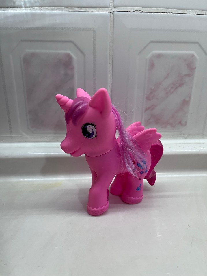 Pembe renkli, boynuzlu ve kanatlı unicorn aksiyon figürü, renkli ve saçlı detaylara sahip.