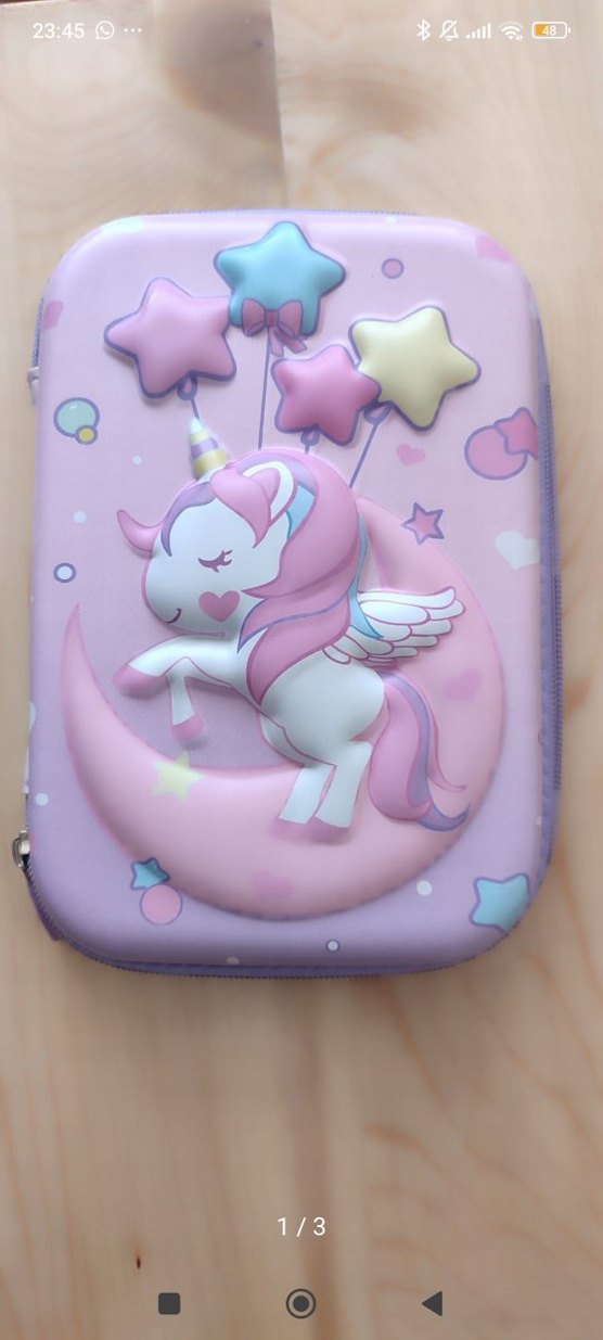 Pembe pastel tonlarda, tokalı kapamalı ve pop kültür temalı unicorn figürlü çocuk kalemlik