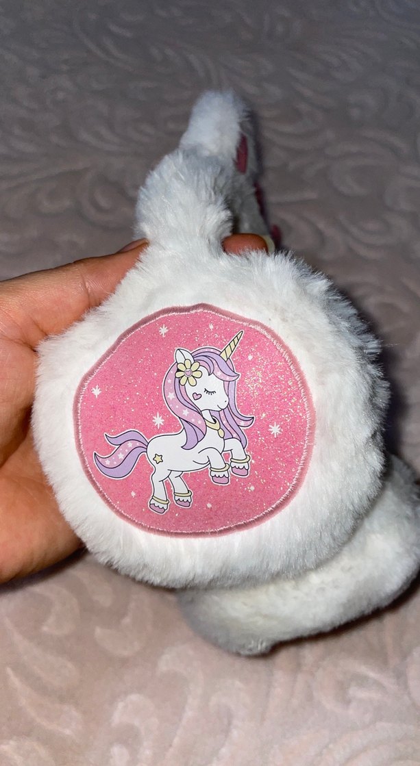 Pembe tonlarında, yumuşak kürklü ve nakışlı unicorn desenli kulaklık, bohem ve retro stiller için uygundur .