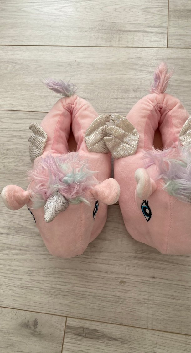 Pembe peluş kumaştan kız ev terliği, nakışlı unicorn detayları ve yumuşak kürk süslemeleriyle bohem ve retro tarzı yansıtıyor.