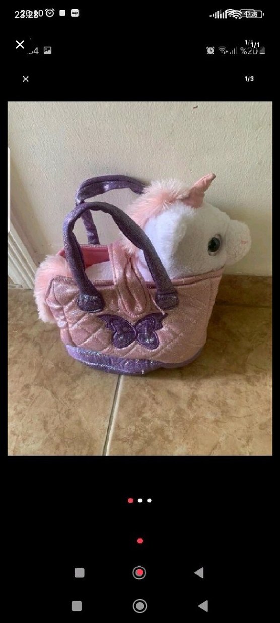 Pembe pastel tonlarda, kelebek detaylı kapitone çanta içinde yumuşak ve sevimli unicorn peluş oyuncak. Mor saplı ve şık tasarım.