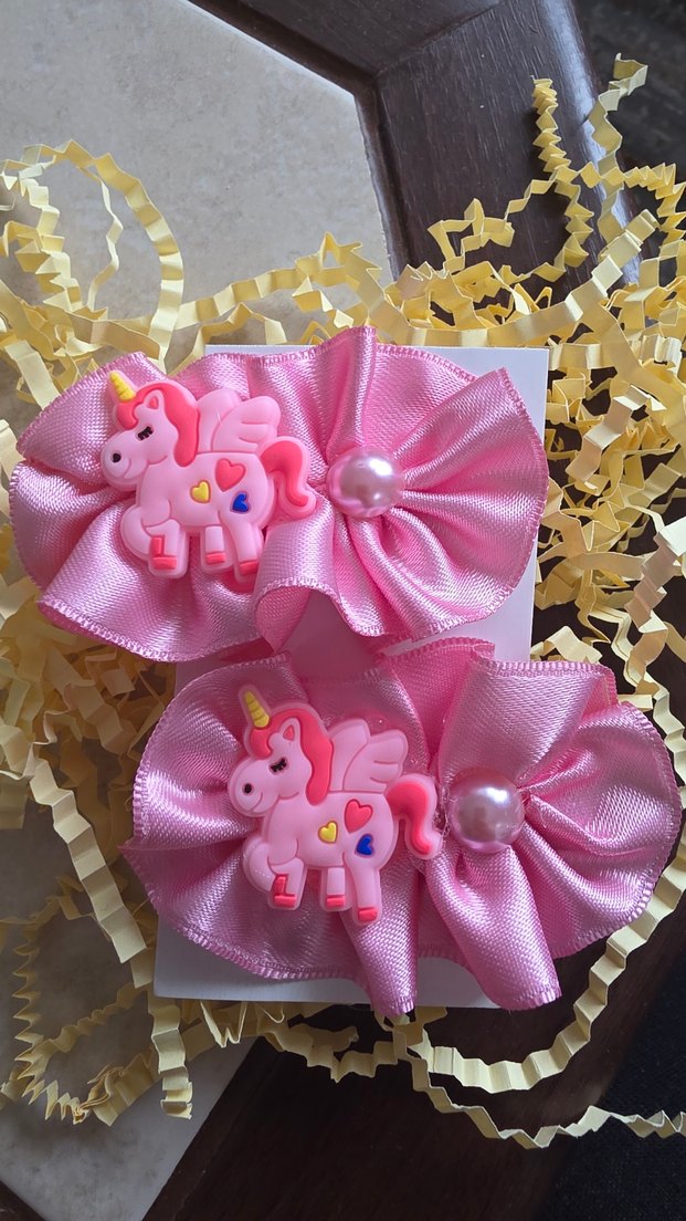 Pembe renkli, işlemeli fiyonk detaylı, unicorn figürlü ve inci süslemeli çocuk saç tokaları seti. Renkli ve eğlenceli tasarım.