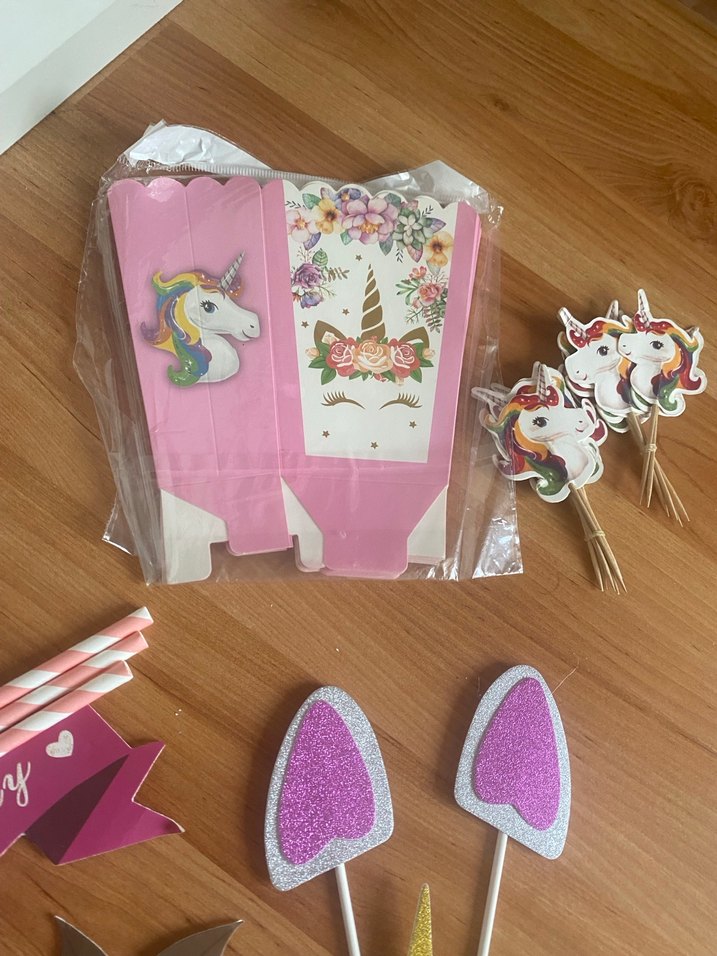 Pastel pembe renkli, unicorn temalı, pasta üstnü süsleme , cupkek süsleme kağıtları ve dekoratif kürdanlar içeren parti seti .