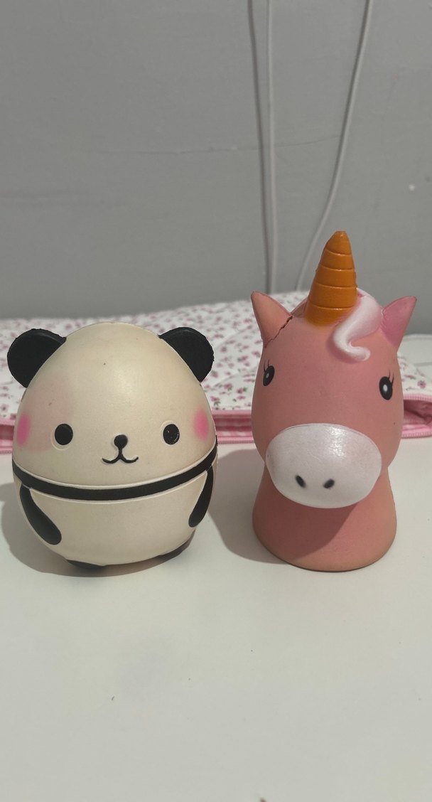 Pembe pastel tonlarda, yumuşak yüzeyli unicorn ve panda squishy, biraz eskiler elden çıkartmak adına uyguna satıyorum. ilan fiyatı ikisi içindir.