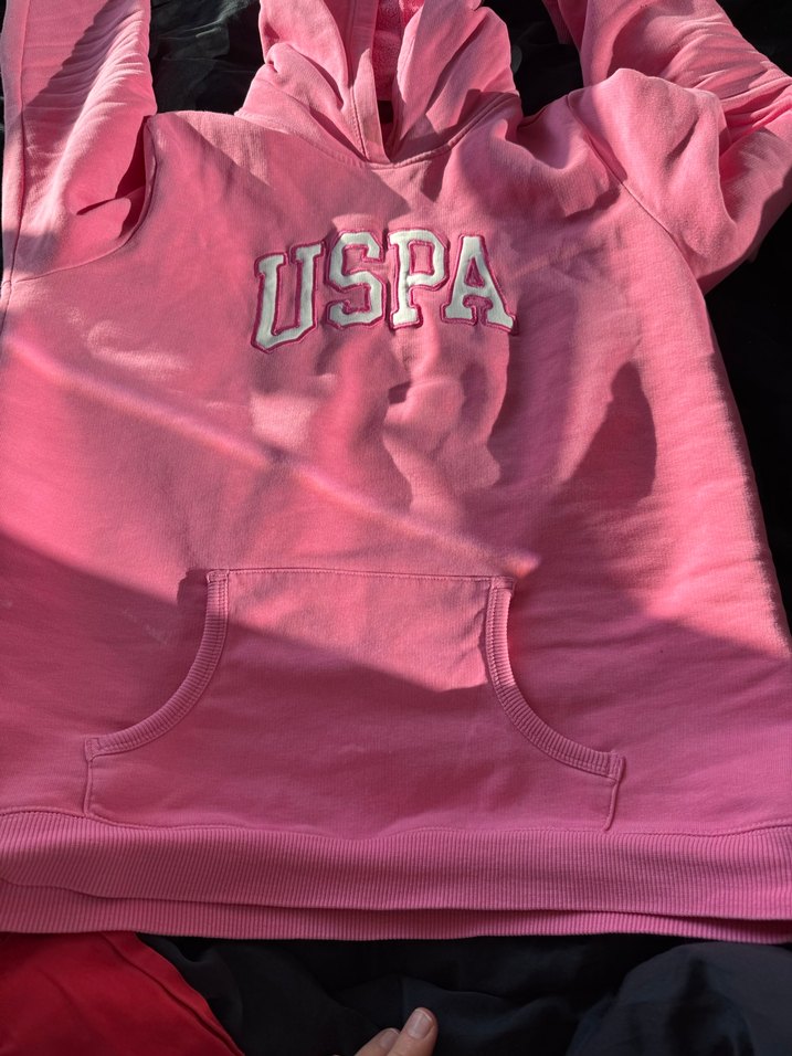 Pembe renkte, USPA baskılı, kapüşonlu ve uzun kollu sweatshirt. Yumuşak ve sıcak kumaştan, sportif ve rahat bir görünüm sağlar. Boğaz altında leke var bir de kolunda bir damla çamaşır suyu var onun dışında hiçbir sorun yoktur resimlerde göründüğü gibidir