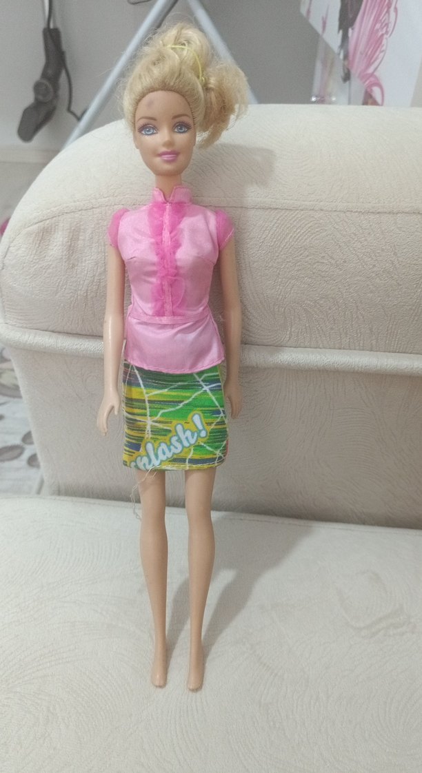 Bu bebek, fırfırlı pastel pembe bir üst ve renkli, splash desenli bir etek giyiyor. Sarı saçları toplu.