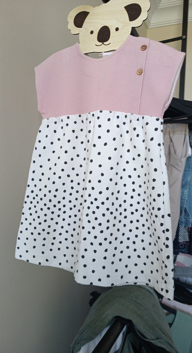 Kolsuz, pamuklu kumaştan yapılmış, bol kesim kız elbisesi. Üstü pastel pembe, eteği siyah puantiyeli beyaz ve omuzda düğme detayı bulunur.
