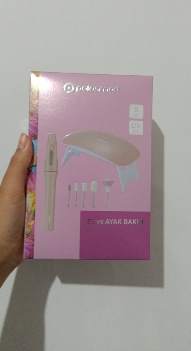 Pembe renkte UV lambası ve beş aparat içeren manikür ve pedikür seti. El ve ayak bakımı için kullanılır.