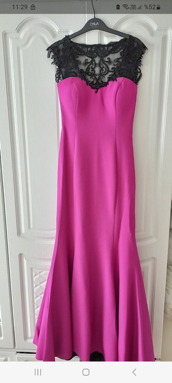 Parlak pembe kumaştan, kayık yaka ve drapeli tasarıma sahip uzun, vücuda oturan abiye elbise. Kolsuz ve düğünler için uygundur, gösterişli ve çağdaş bir tarz sunar.