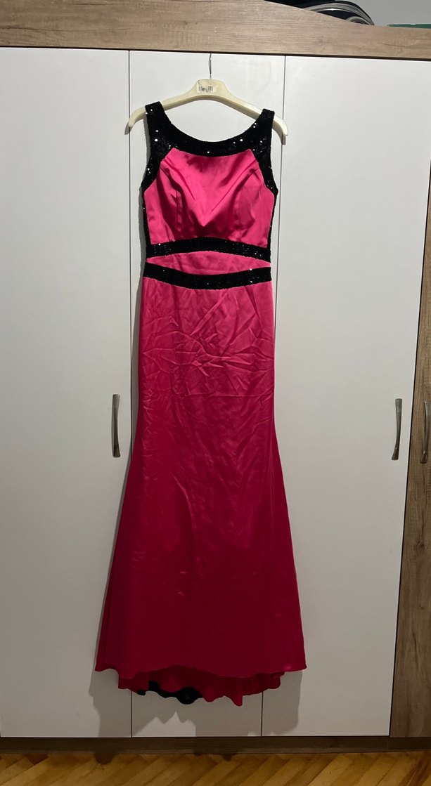 Uzun, dar kesim siyah pullu abiye elbise . Canlı pembe ve siyah detaylarla göz alıcı bir görünüm sunar.