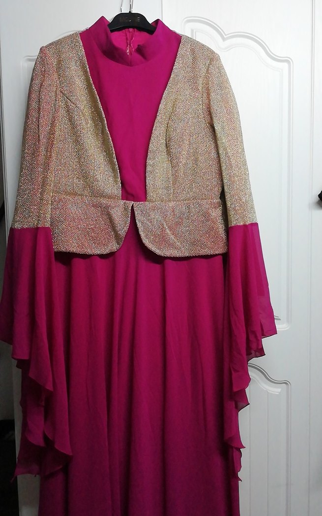 Pembe, parlak ve uzun abiye elbise, straplez ve kolsuz tasarıma sahip. Üzerinde drapeli, ışıltılı altın renkli ceketle tamamlanmış, düğünler için çağdaş ve göz alıcı bir stil sunar.