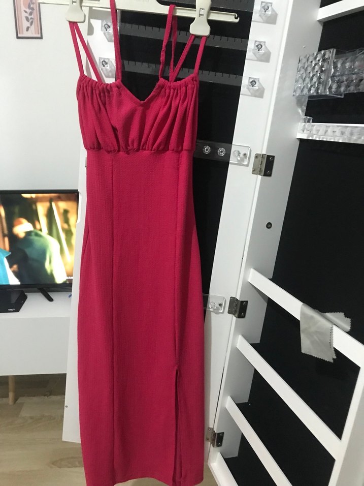 Pempe renkli, ince askılı ve drapeli detaylı, sentetik kumaştan yapılmış, vücuda oturan uzun elbise. Modern klasik tarzda, romantik akşamlar için uygundur.