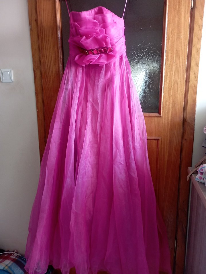 Pembe renkte, askılı ve drapeli tasarıma sahip uzun, bol kesim kadın abiye elbisedir. Pastel tonlarda batik desenli bohem tarzda, düğün için uygundur. etek ucunda yırtılmalar oldu boy ayarlama yapılırsa sıkıntı olmaz