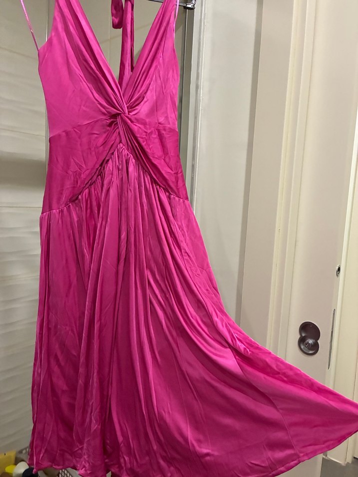 Parlak pembe, drapeli, V yakalı ve askılı uzun, dar kesim kadın elbisesi, cesur ve bohem tarzda parti için uygundur. Astarlı boyundan bağlı
