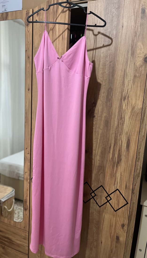 Pastel pembe, askılı uzun elbise, şık tasarımla ve ipeksi kumaştan, rahat kesimlidir. Sokak stiline uygun bohem ve retro havası taşır.