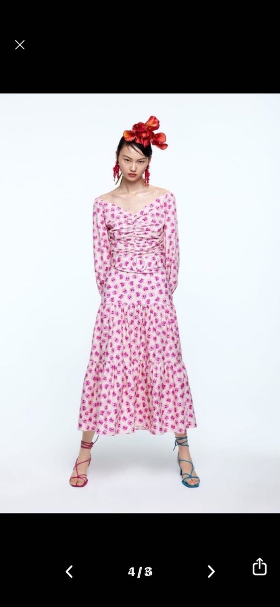 Uzun, bol kesim elbise, tekne yaka ve drapeli tasarıma sahip. Askılı kolları ve pastel pembe batik deseni ile şık bir parti görünümü sunar.
