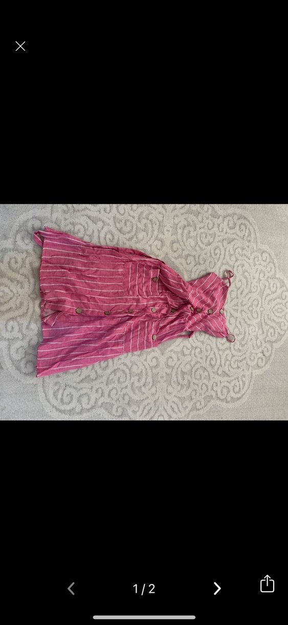 Uzun, vücuda oturan kadın elbisesi, tekne yaka ve ince askılarla tasarlanmıştır. Yumuşak sentetik kumaştan yapılmış, pembe batik desenli ve düğme detaylıdır. Günlük kullanıma uygundur.