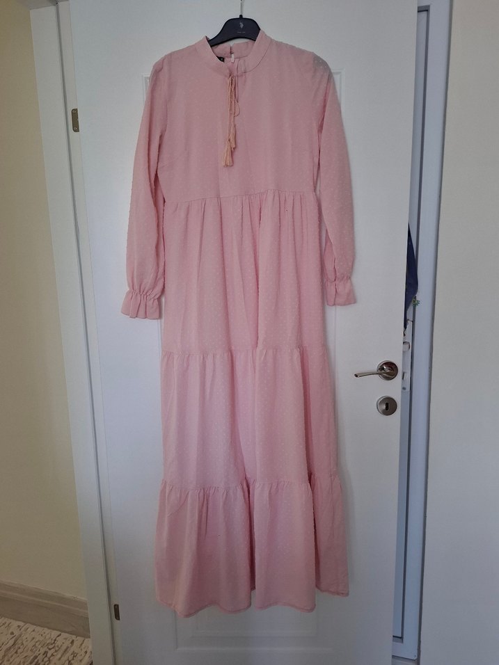 Yumuşak keten kumaştan yapılmış, uzun, pembe, bol kesim ve volanlı katmanlara sahip bohem tarzda elbise. Yüksek yakalı, günlük kullanıma uygun.