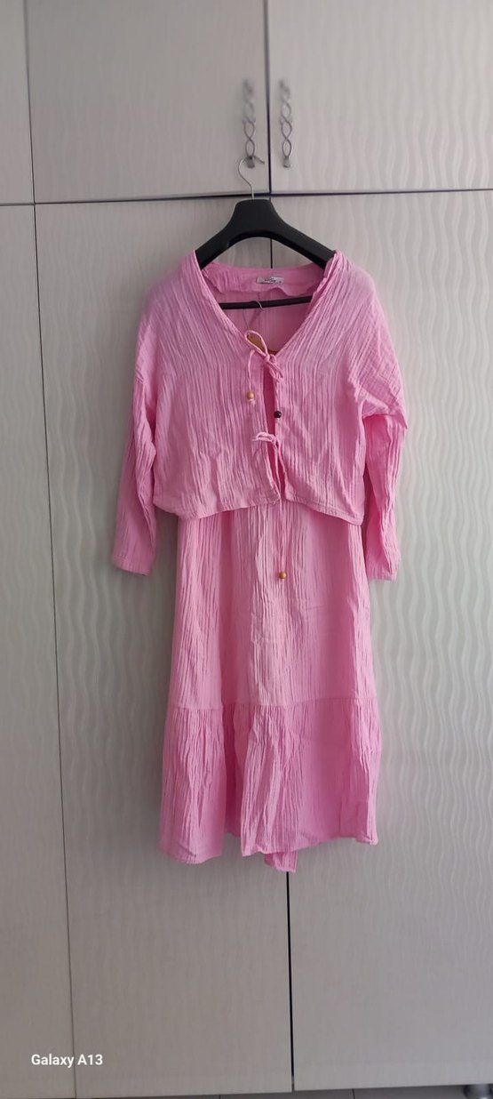 Yumuşak kumaştan, bol kesim, pembe uzun elbise. V yaka, askılı kol ve düğme detaylarıyla bohem tarzı yansıtıyor.Sadece bir kez giyildi..