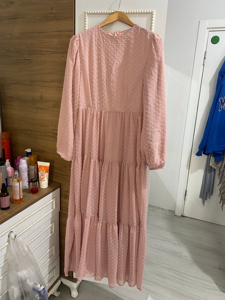 Pembe uzun, bol kesim elbise, volanlı ve uzun kollu, yuvarlak yakalı. Yumuşak sentetik kumaştan, bohem tarzda.