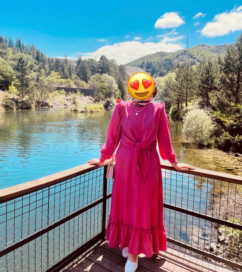 Yumuşak ve sıcak kumaştan yapılmış, uzun, bol kesim pembe elbise yüksek yakalı ve fırfırlı detaylara sahip. Renkli batik deseni ve bel bağlama detayı bulunur.