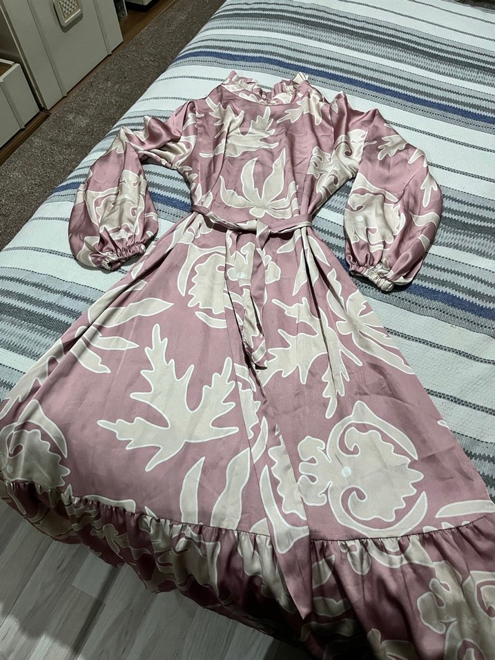 Pembe uzun elbise, bol kesim, yüksek yaka ve uzun kolludur. Yumuşak sentetik saten kumaştan yapılmış, pastel tonlarda batik desenli ve fırfır detaylıdır. Bohem tarzını yansıtır.