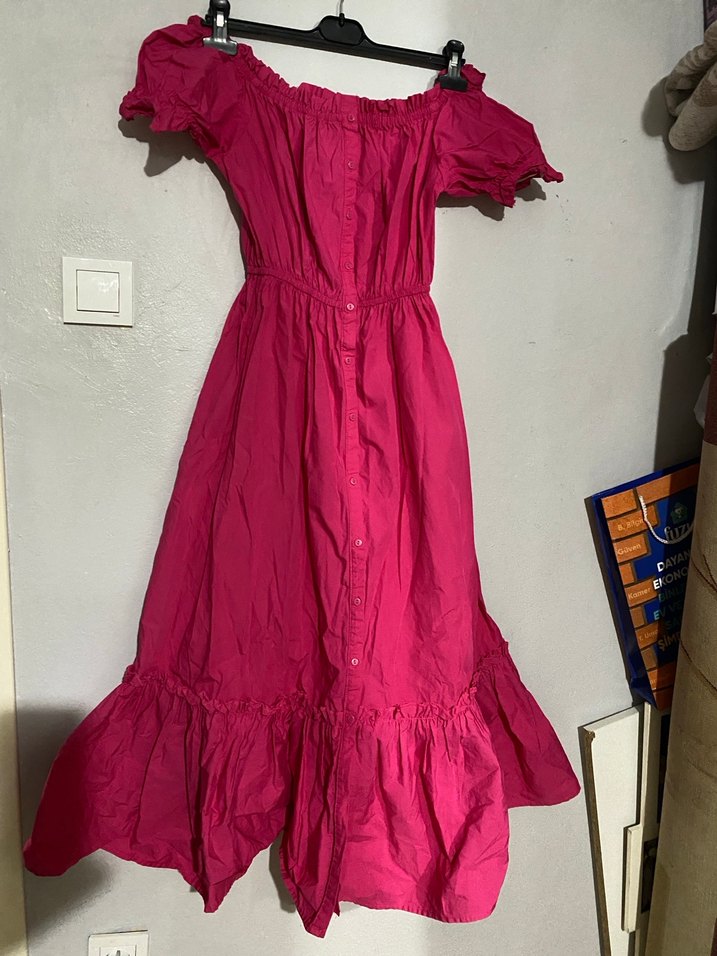 Uzun, elbise, fırfır detaylı ve bol kesimdir. Yumuşak sentetik kumaştan yapılmış koyu pembe renktedir. Romantik akşamlar için uygundur.