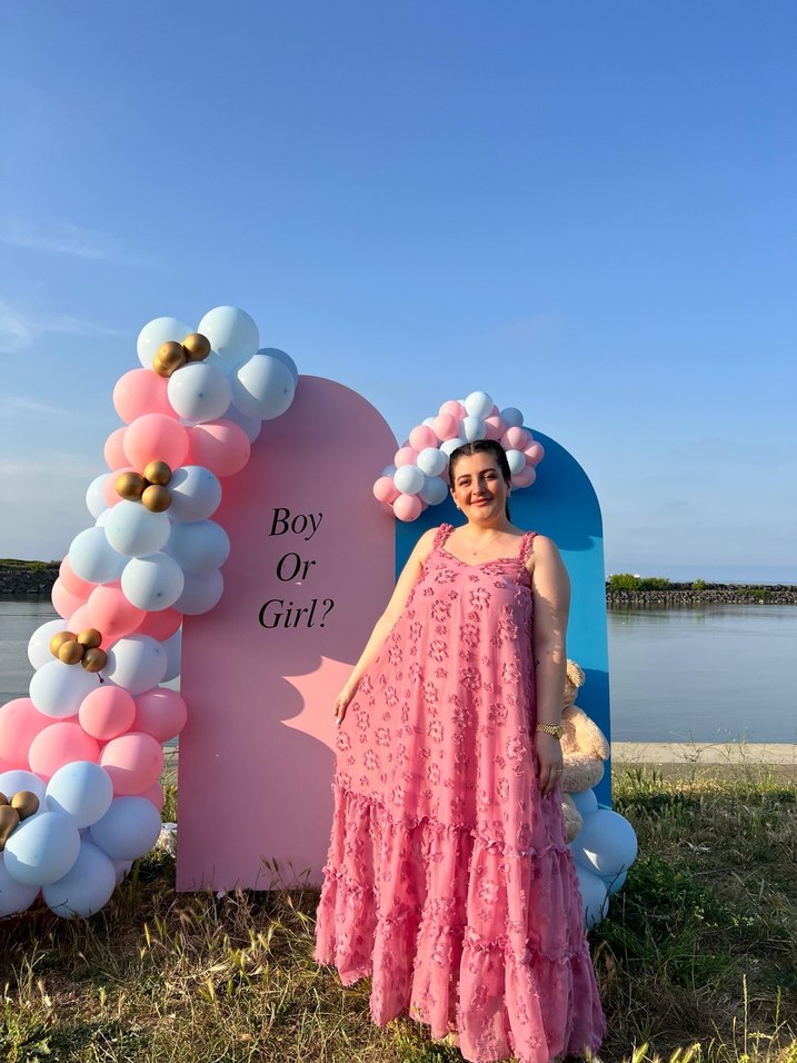 Pembe uzun elbise, bol kesim ve fırfır detaylarıyla. Yumuşak sentetik kumaştan, pastel tonlarda batik desenli, bohem tarz için uygundur. Az kullanıldı temizdir
