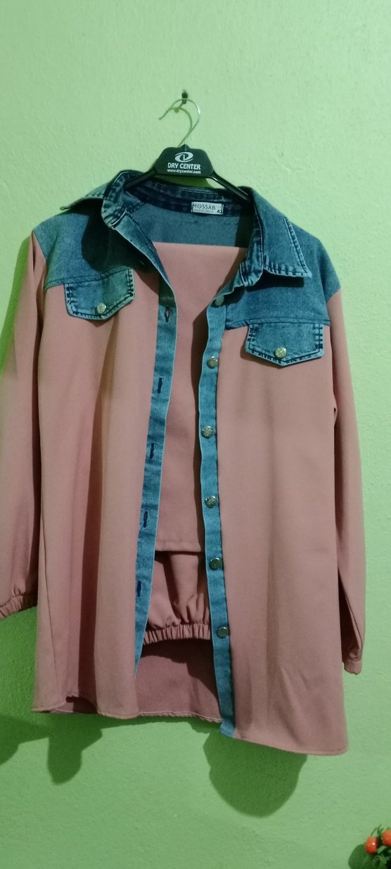 Uzun kollu, regular fit kadın ceketi, düğmeli önüyle pastel pembe kumaş ve denim detayları içerir. Notlu yaka ve cepleriyle günlük sokak stili için uygundur.
