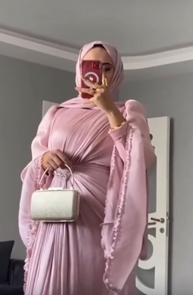 Açık pembe renkte, uzun kollu, drapeli ve salaş kesim şık abiye elbise. Straplez yaka, şal ile tamamlanmış. Bohem tarzda, düğünde için uygun. Krlk 1.500₺