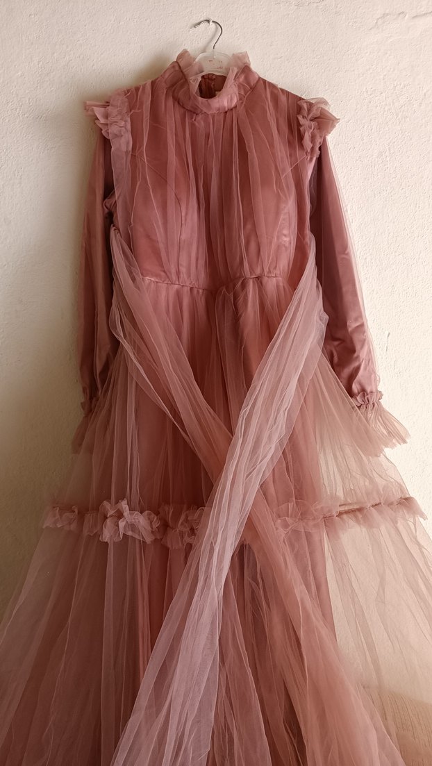 Pembe renkte, uzun ve drapeli yapıya sahip kadın elbisesi. Yüksek yakalı, askılı kollu ve bol kesim vintage bohem tarzı, düğünler için uygun.