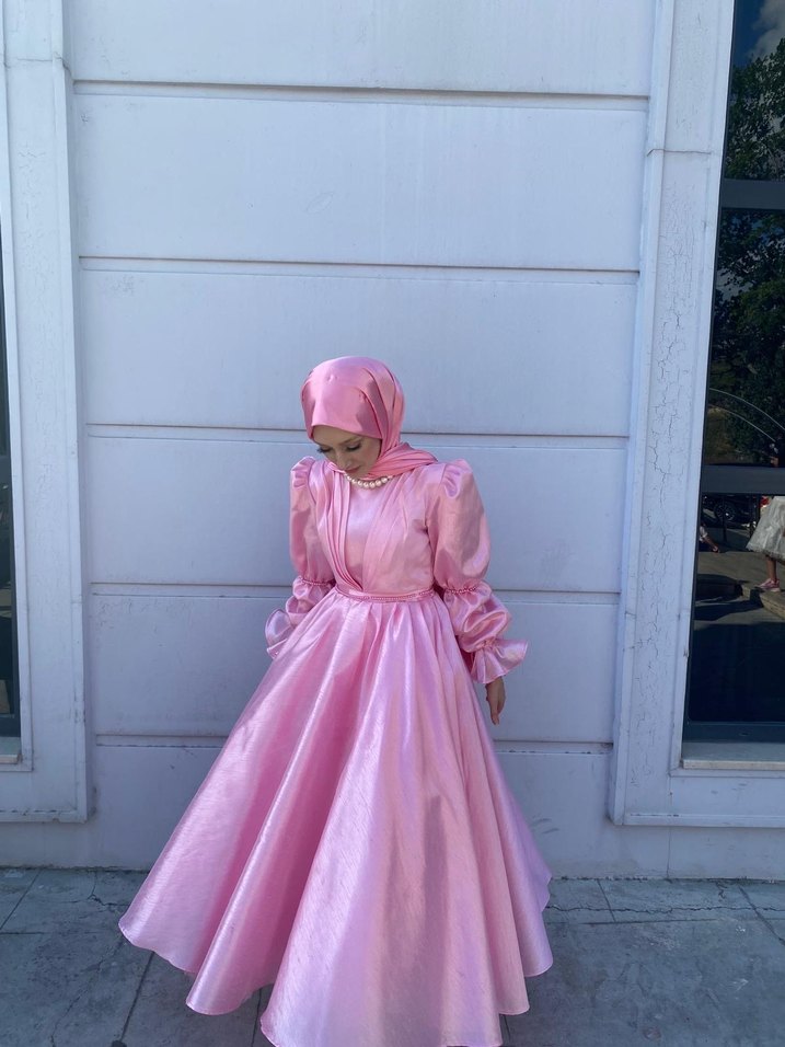 Pembe uzun abiye, drapeli tasarımı, yüksek yaka ve bol kesimiyle dikkat çeker. Askılı kolları ve desensiz yüzeyiyle düğünler için uygundur. Arkası iplidir