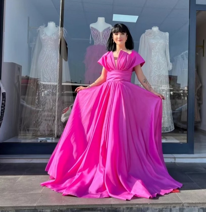 Pembe parlak kumaştan, V yaka ve ince askılı uzun drapeli kadın abiye elbise. Düğün ve özel davetler için modern klasik tarzda, rahat kesim ve şık duruşa sahiptir.