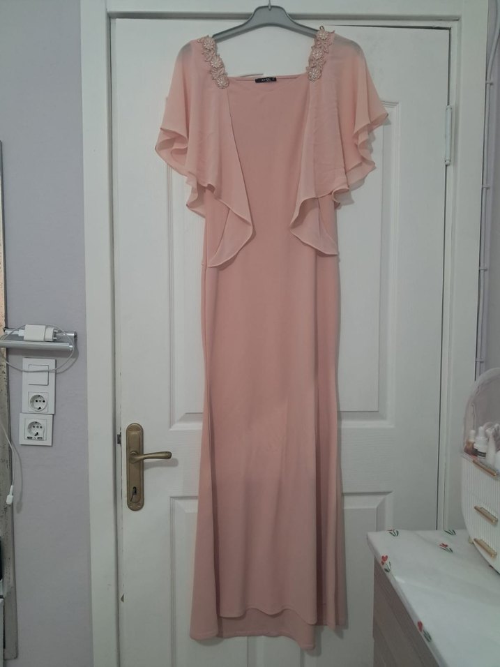 Pembe Uzun Drapeli Kadın Abiye Elbise