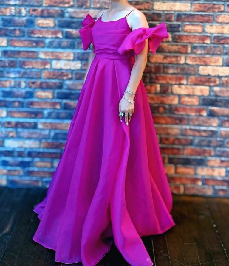 Pembe uzun drapeli kadın abiye elbise, kayık yaka ve askılı kollara sahiptir. Bol kesimli ve çağdaş tarzdadır, düğün için uygundur.