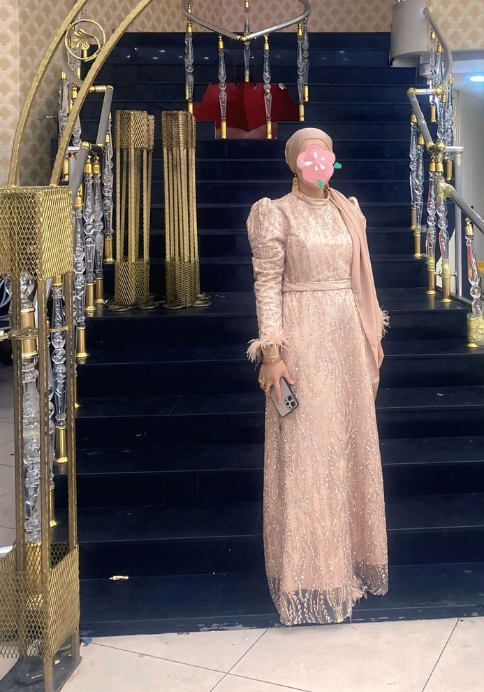 Bu açık pembe abiye elbise, yüksek yakalı ve ince askılı, vücuda oturan kesime sahiptir. Drapeli ve sade tasarımıyla düğünler için uygundur. ✨