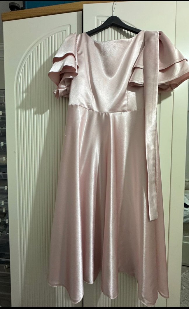 Pembe renkte, uzun boy drapeli ve bol kesim kadın abiye elbise. Askılı kol detayları ve straplez yakasıyla şık, parlak modern klasik tarzda, düğün için uygun.Gelin hamamımda sadece fotograf çekilirken giydim