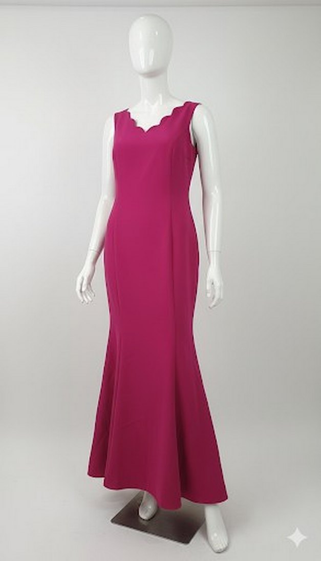 Bu pembe uzun ve drapeli abiye elbise, tekne yakalı ve kolsuzdur. Parlak kumaşı ve klasik modern tarzıyla düğünler için uygundur.