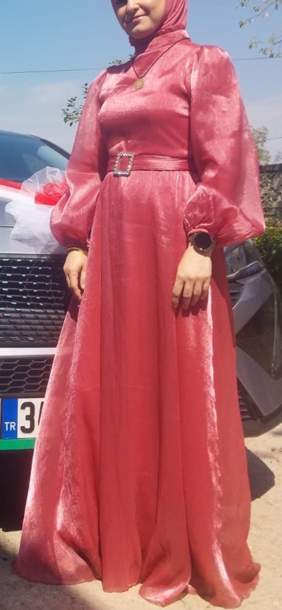 Parlak pembe uzun elbise, drapelidir. Bohem tarzda ve rahat kesimlidir. Düğünler için uygundur. Çok az giyildi.