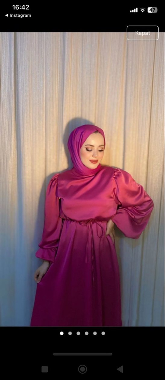 Uzun kollu, bol kesim, yüksek yakalı ve drapeli silüete sahip bu parlak pembe saten elbise, bağlama detaylı ve batik desenlidir. Günlük kullanıma uygundur.