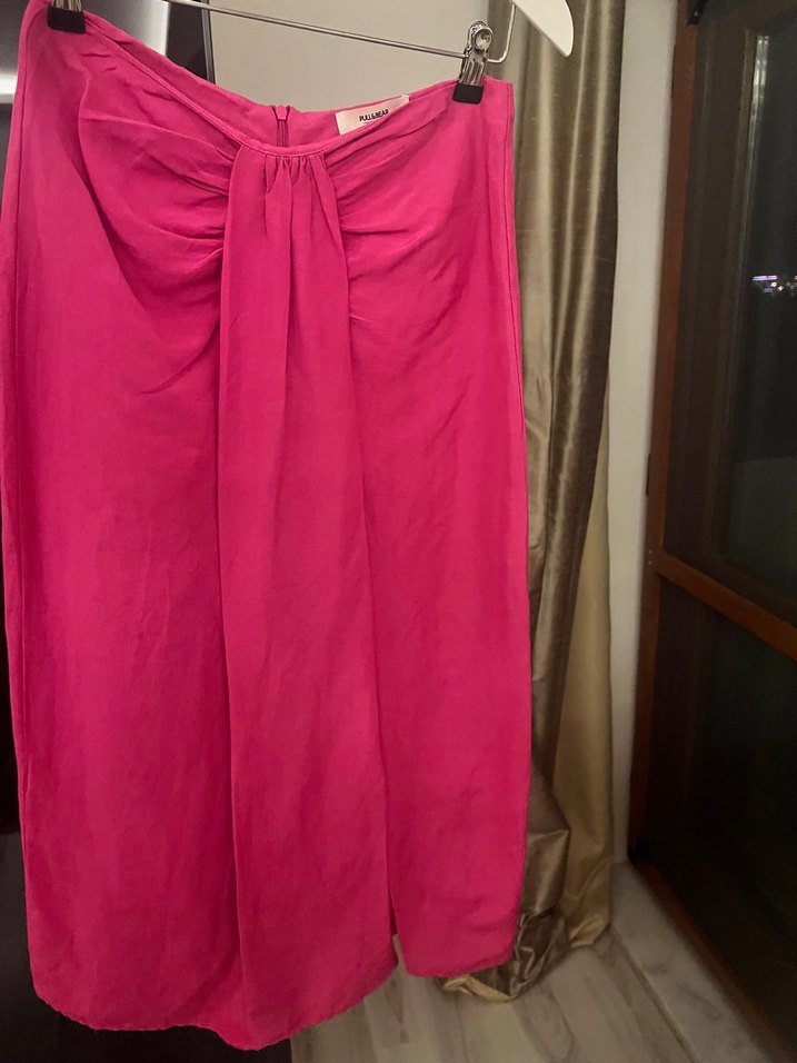 Pembe renkte, uzun ve drapeli tasarıma sahip, bol kesim kadın eteği. Keten kumaştan üretilmiş olup, çağdaş Paris tarzına uygundur.