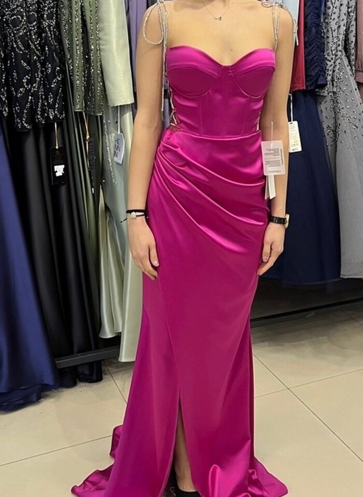 Bu pembe, parlak ve drapeli uzun abiye elbise, straplez ve ince askılıdır, romantik akşamlar için uygundur. Nişan için 1 kere kullanıldı kuru temizleme yapıldı