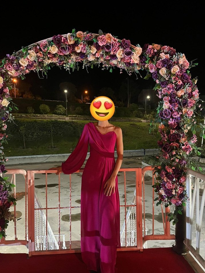V yaka, drapeli ve tek kollu askılı pembe uzun elbise, parlak batik desenli ipeksi kumaştan, cesur parti görünümü için uygundur.