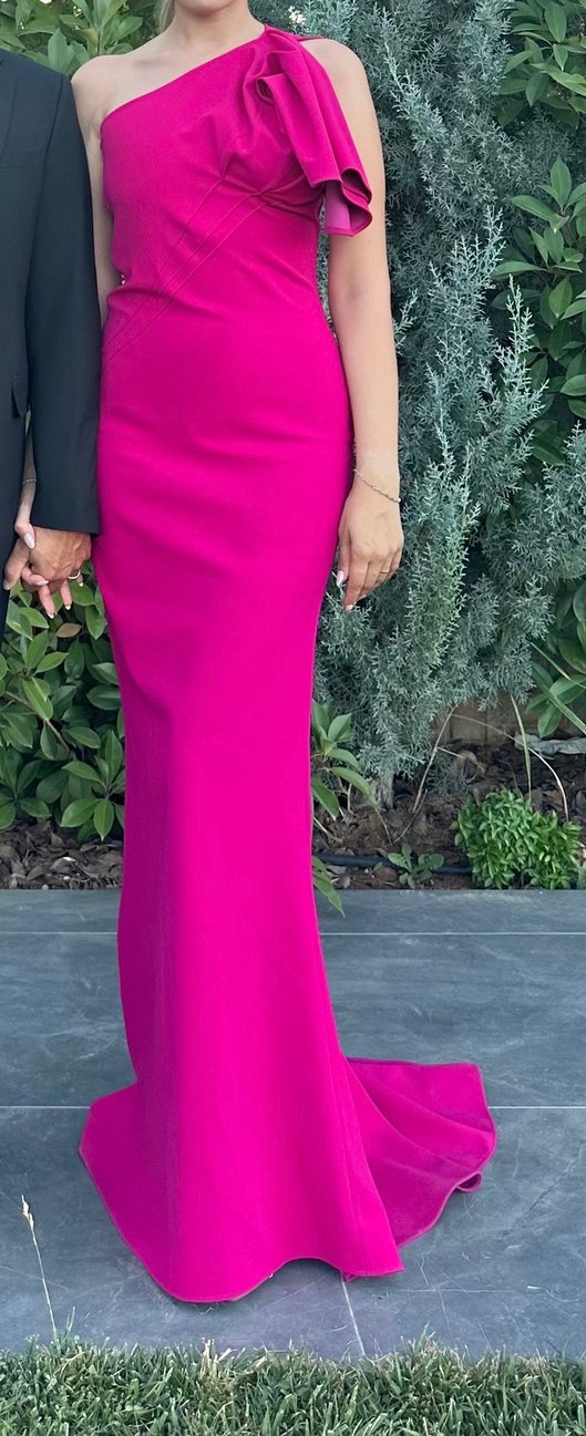 Bu pembe uzun elbise, drapeli tasarımı ve V yakası ile klasik ve şık bir duruş sunar. İnce askılı, düğünlere uygundur.