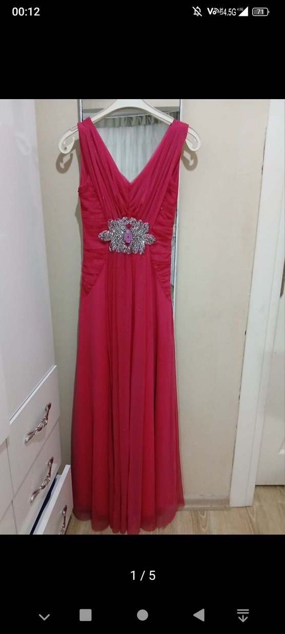 Pembe uzun, drapeli ve v yaka abiye elbise. Kolsuz, bel kısmında taş işlemeli detaylı, klasik ve şık bir tasarım.