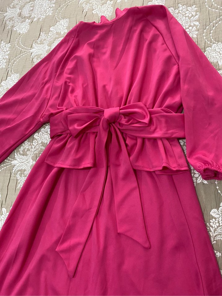 Pembe uzun elbise, drapeli tasarım ve V yakaya sahiptir. Parlak sentetik kumaştan, askılı kollar ve bele bağlama detaylıdır. Zarif davetlere uygundur. 3 parça defa yok pazarlıksız 1 kere giydim kendime yakıştıramadım rengini ondan satıyorum