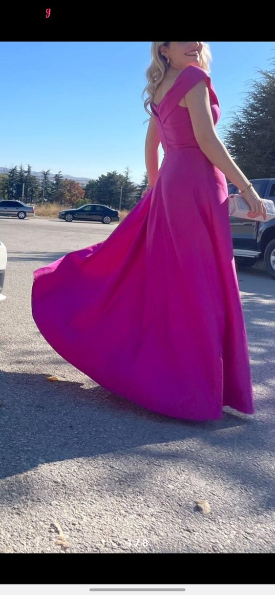 38 beden / omza düşen kola çok kötü dikiş yapılmış, düğün esnasında dikişler koptu, o an alelacele bi dikiş yapıp tutturmuştum. Boyum 170. Topuklularla yere sıfır oluyordu. İç göstermiyor. Yırtmacı yok. Çok rahat hareket edebiliyordum. Rengiyle rahatlığıyla kumaşıyla çok sevdiğim elbisemi satıyorum. Pembe, uzun ve drapeli detaylara sahip v yaka, fitted kesim abiye. İnce askılı kolları ve parlak dokusuyla düğünler için şık bir seçenek.