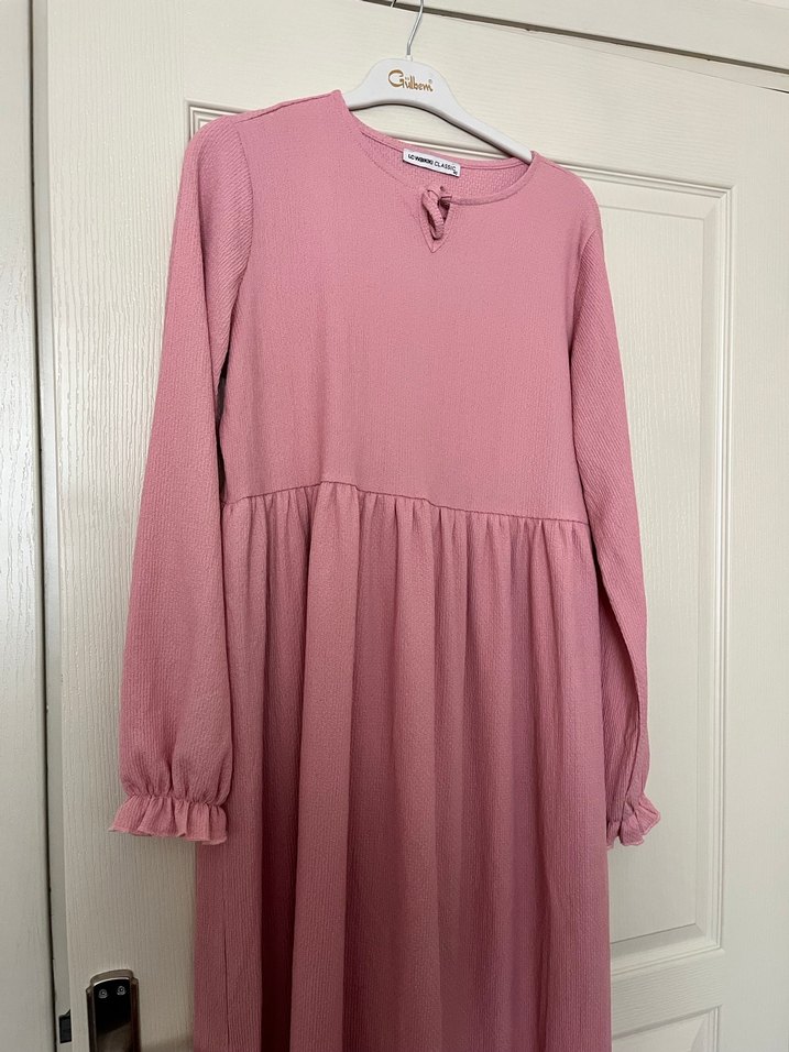 Pembe uzun elbise, uzun kollu ve bisiklet yaka. Manşetlerde ve belde fırfır detaylarıyla salaş ve rahat kesim sunar. Kumaşı çok yumuşak ve hiç ağır değil tok bir kumaşı bar hiç giymedim 40 42 arasına rahat olur 38 se gıdebılır belıne kemer ile mağazada şuan 890 tl uyguna bırakıyorum
