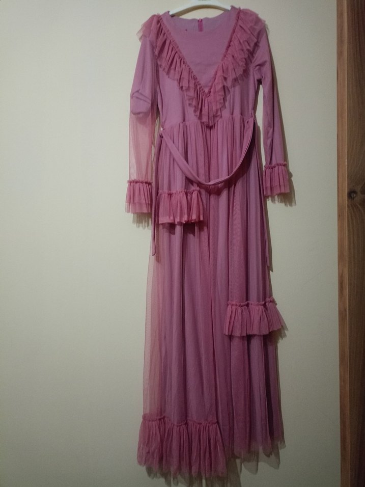 Fırfırlı detaylara ve V yakaya sahip, ince askılı, bol kesim uzun pembe elbise. Yumuşak sentetik kumaştan, bohem tarzda, düğünler için uygun. hiç kullanılmamış yeni sorunsuz içi astarlıdır
