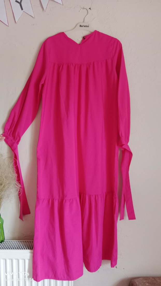 Pembe uzun elbise, yüksek yakalı, bağcıklı uzun kollu ve etek kısmında fırfır detaylıdır. Salaş kesimi ve ipeksi dokusuyla bohem tarzı yansıtır.
